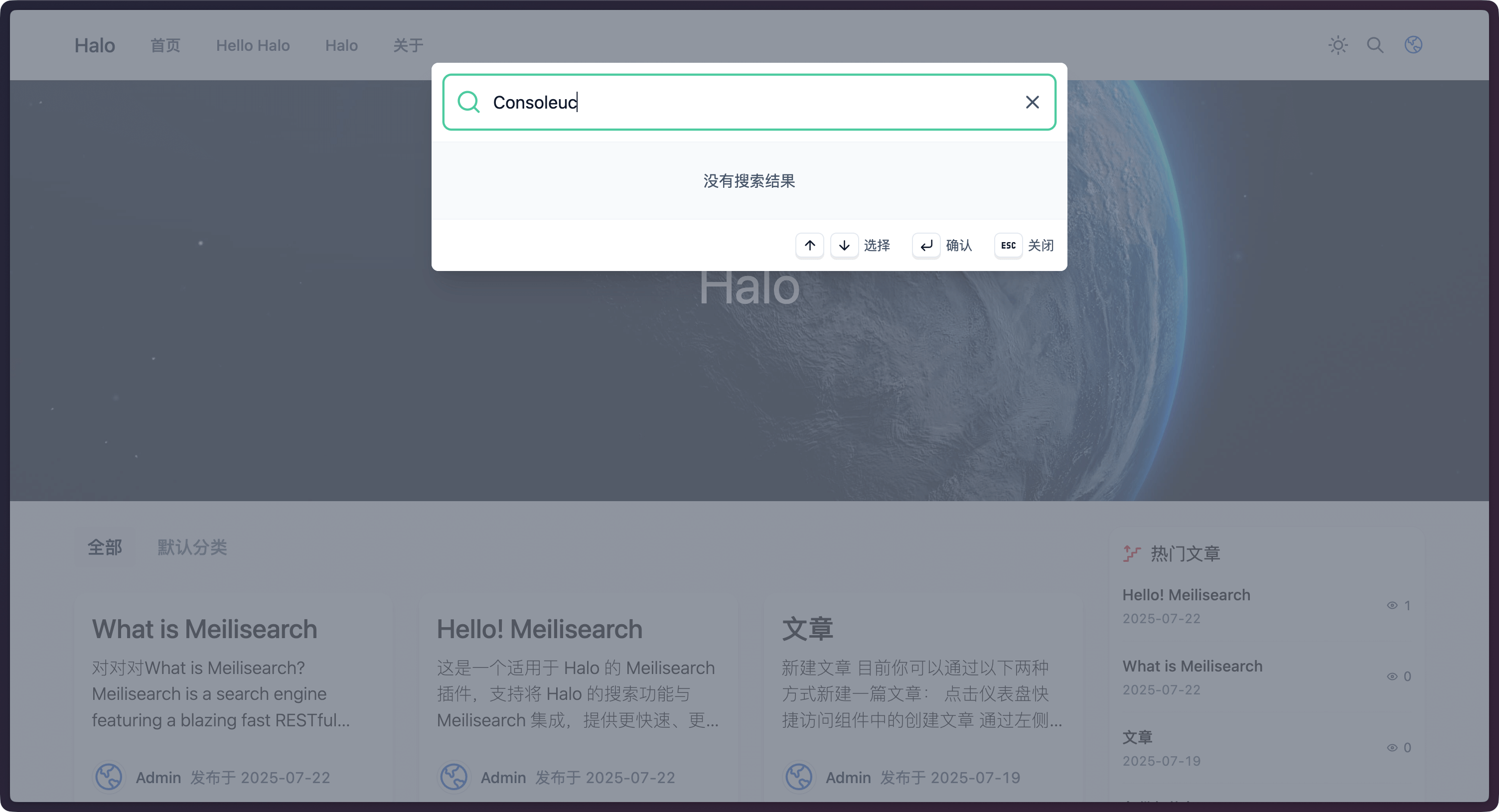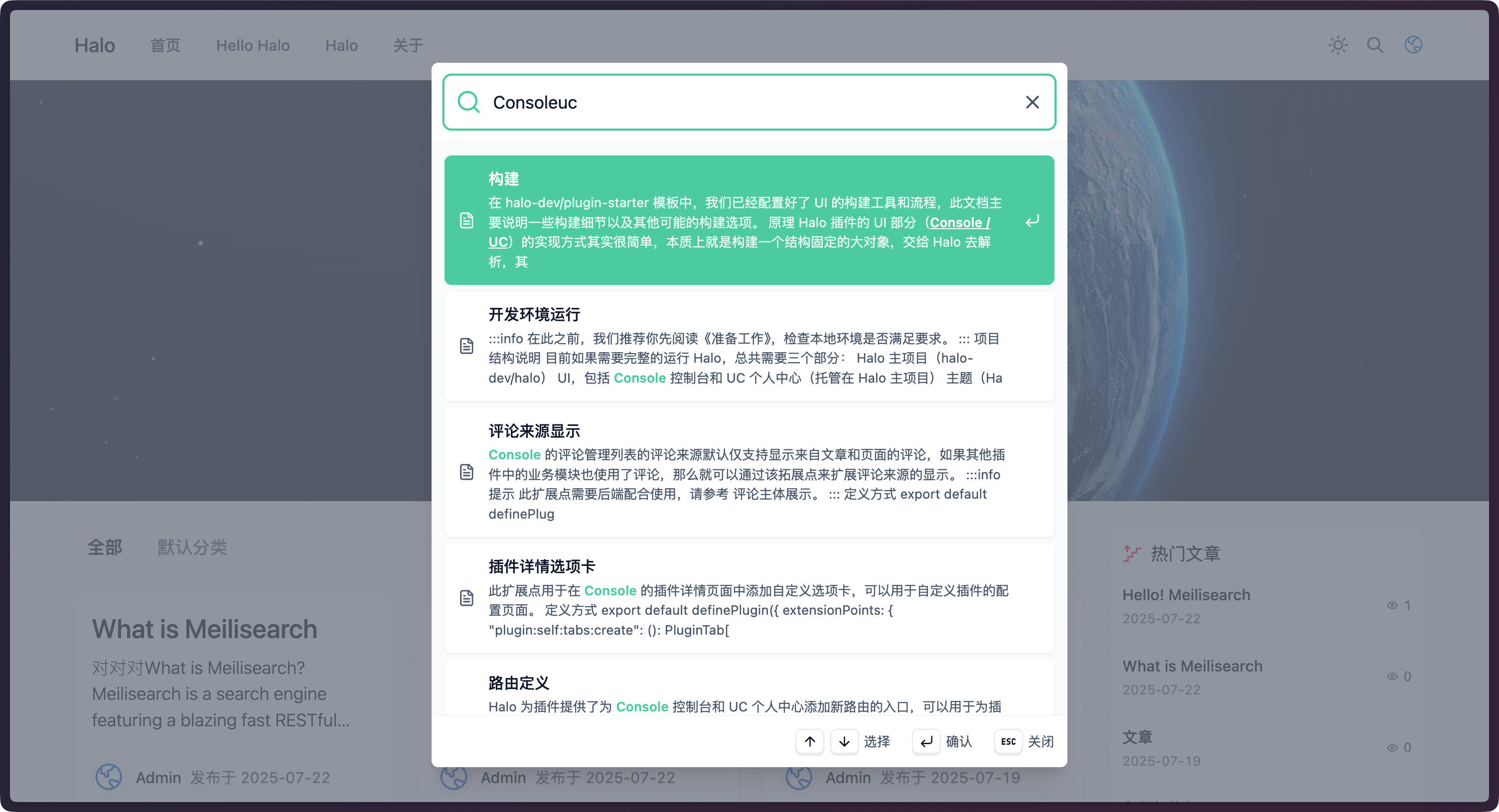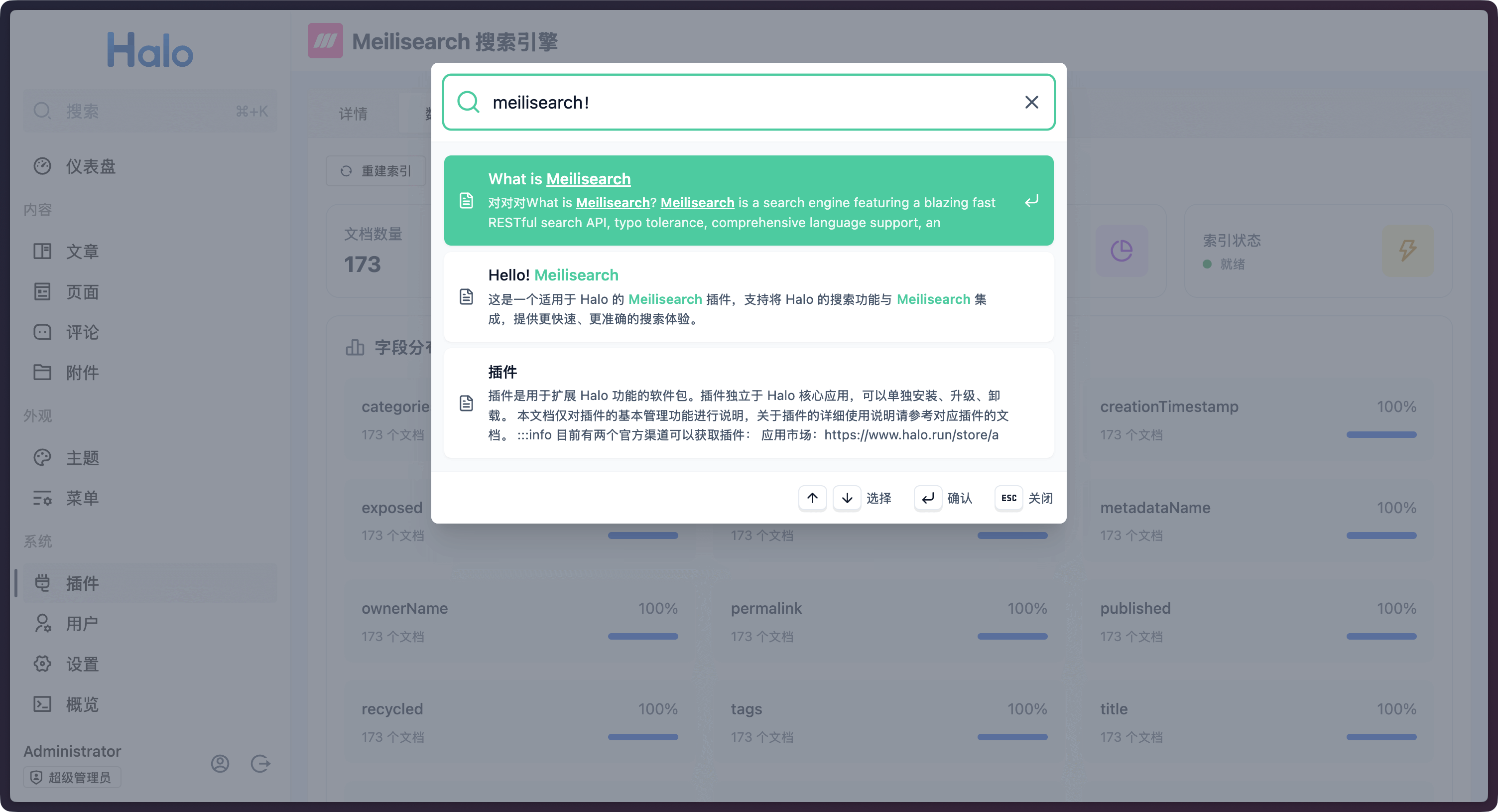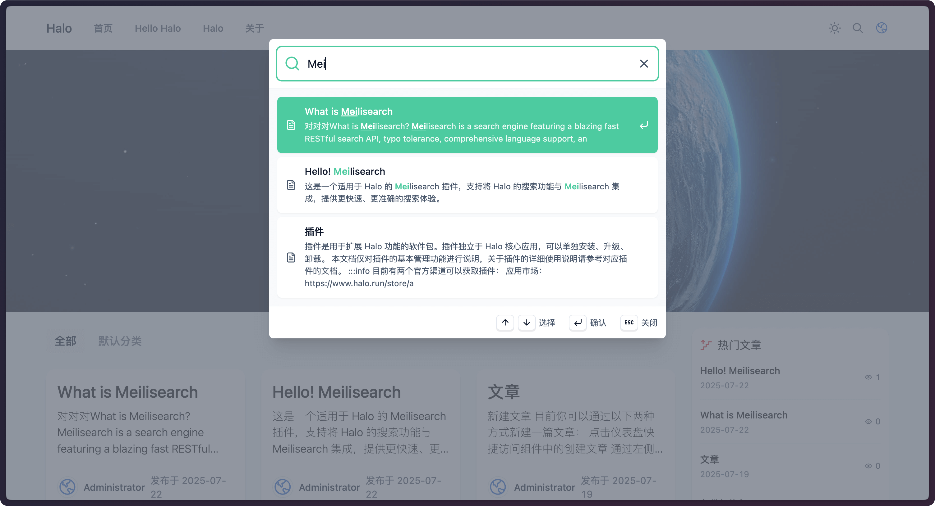 之前 Halo 社区中已经有人开发了 Meilisearch 插件,但已经不再维护,因此这里我们选择使用 Halo 官方提供的插件。