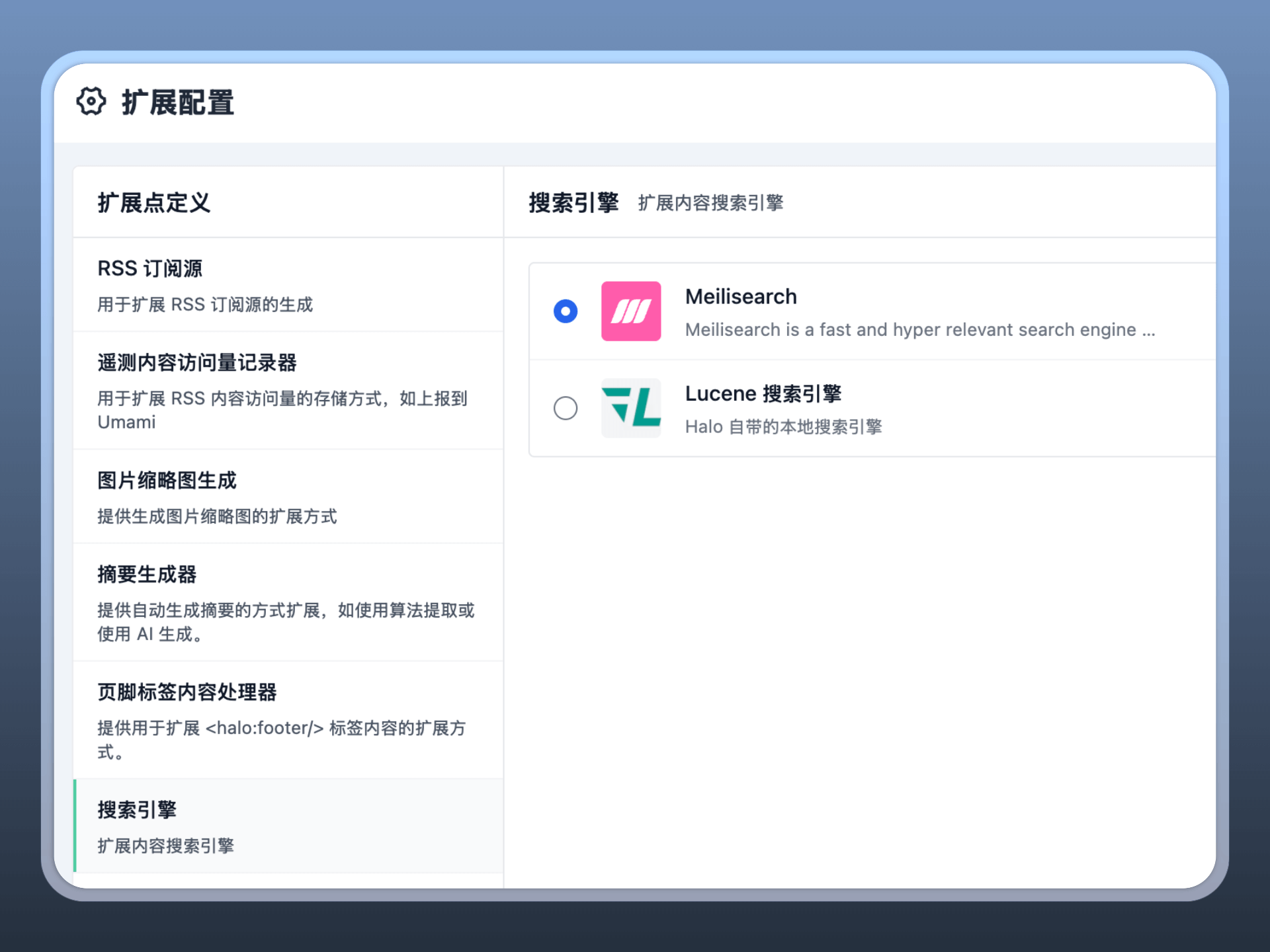 进入插件扩展配置,在 扩展点定义 中选择 搜索引擎,然后选择使用 Meilisearch。