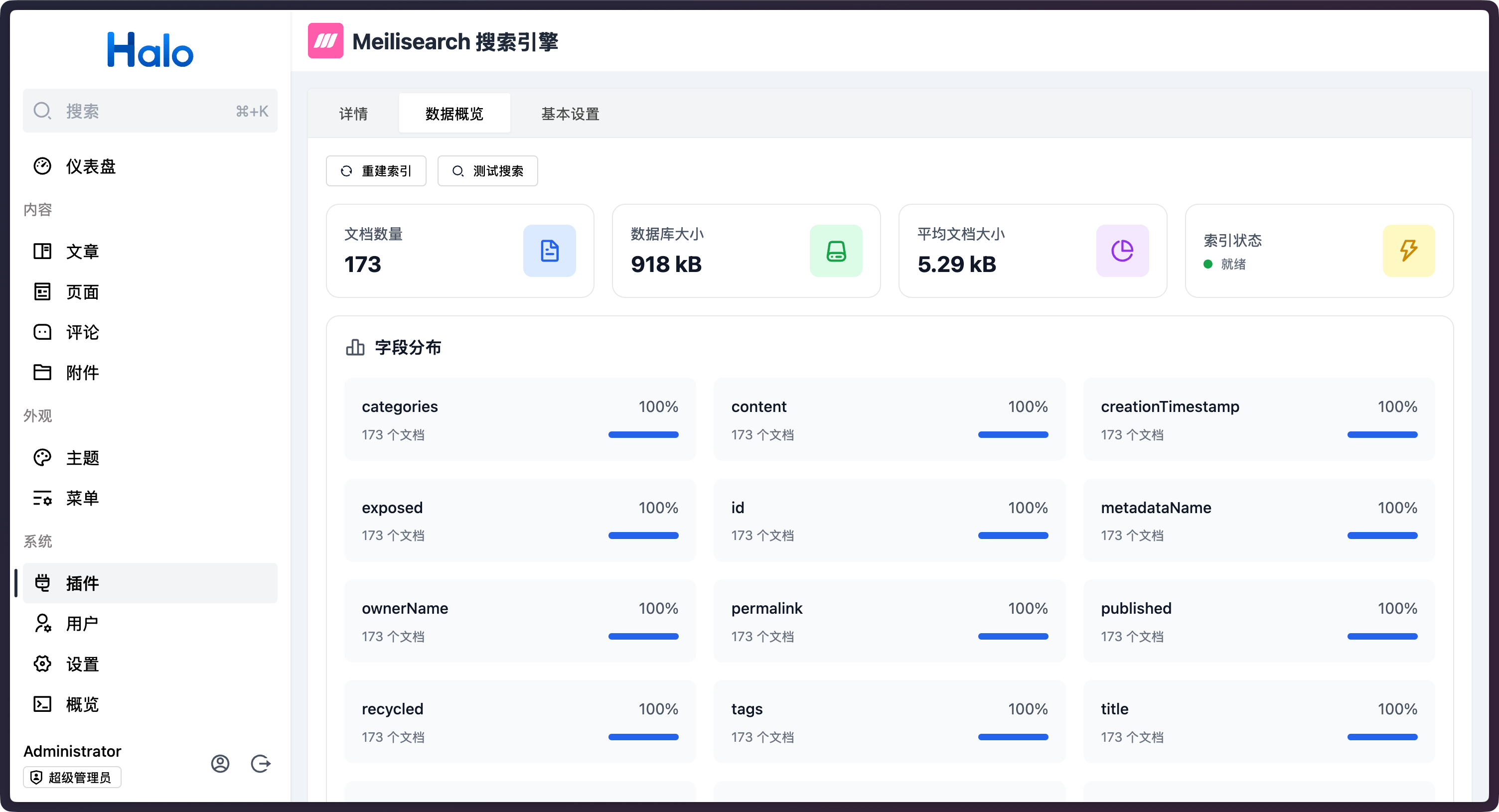 配置完插件后,我们可以进入插件的 数据概览 页面,查看 Meilisearch 的索引数据。